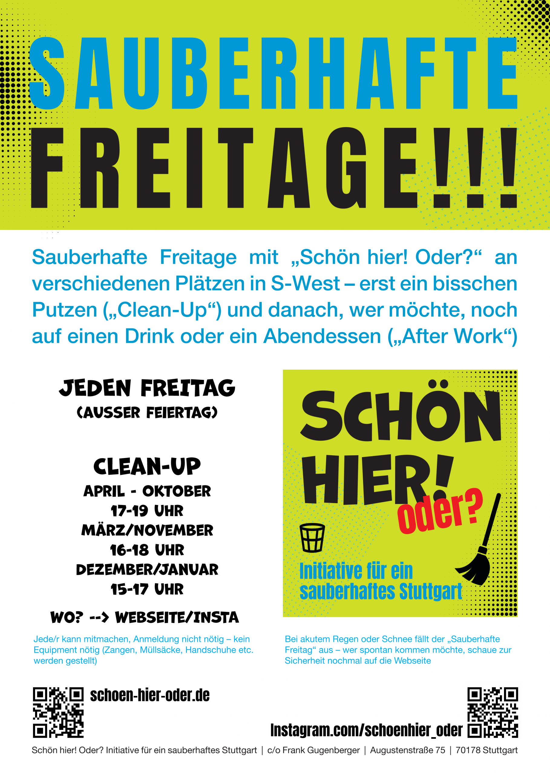 Wir behalten wir uns vor, den Sauberhaften Freitag auch einmal kurzfristig abzusagen, wenn sich nicht genügend Mitstreiter:innen finden. Und bei akutem Regen oder Schnee fällt der sauberhafte Freitag i.d.R. aus!