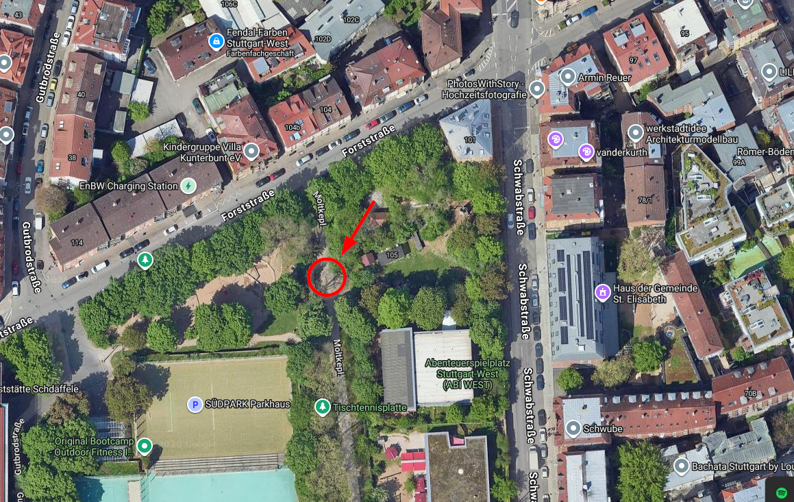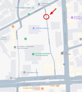 Unser Standort wird auf dem Fußweg zwischen Forststraße und Bürgerzentrum sein, am Eingang des öffentlichen Spielplatzes gegenüber vom ABI West